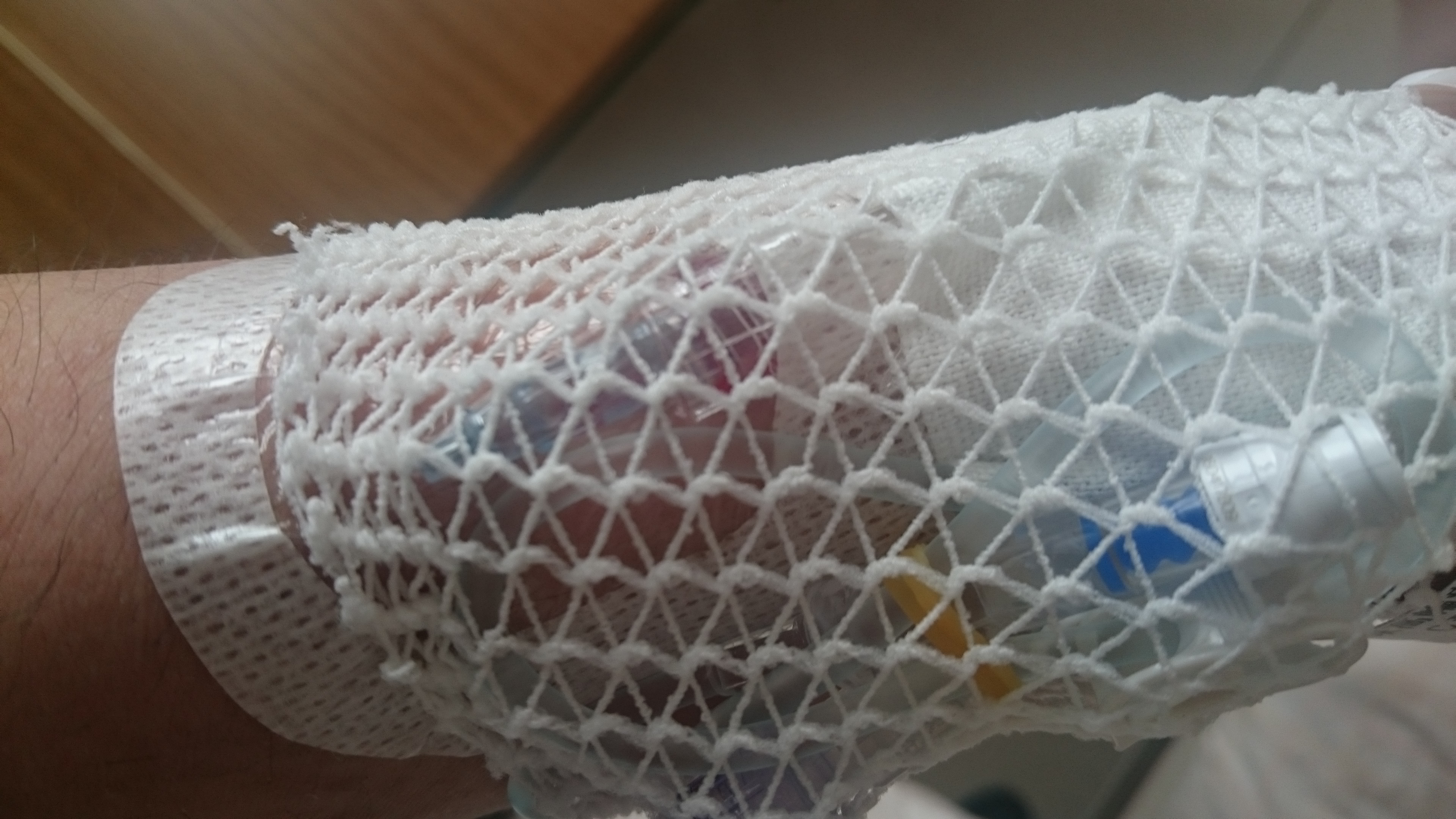 先ほど失敗した親指の上、さらに上を一発で成功、さすがベテラン。点滴の経路は手の甲に近づくにつれて痛いけど、手の甲は血管が見えやすいので取りやすいみたいです。点滴を外したあと手首をそらせると結構痛みが残りました。